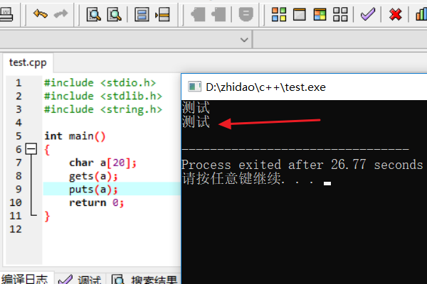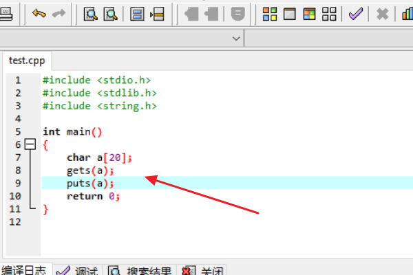 2、在test.cpp文件中,输入C语言代码:char a[20];gets(a);puts(a);。