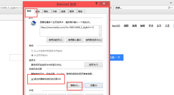 4、在弹出的界面中,点击“常规”选项卡,勾选“退出时删除浏览历史记录”选项,单击“删除”按钮