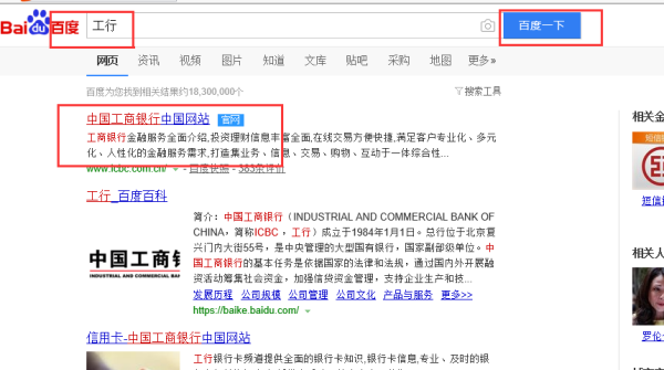 6、在百度中输入“工行”,单击“百度一下”按钮,单击“中国工商银行中国网站”官网