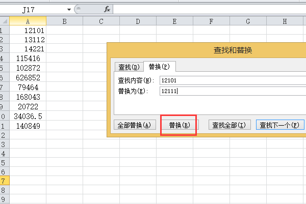 4、此时弹出替换对话框,在查找内容中输入需要被替换的数据,如12101,再在替换为中输入如12111后,点击替换。