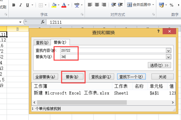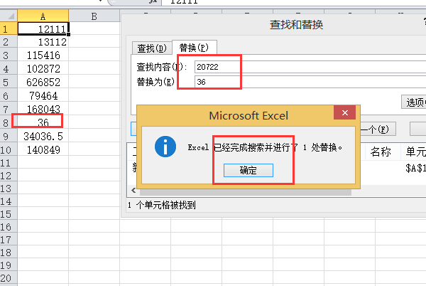 6、如将20722替换为36,则在超找内容中输入20722,替换为中输入36,点击替换即可。