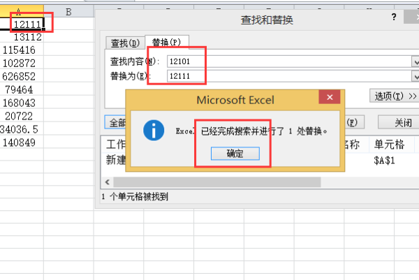 5、此时弹出提示框显示已经将12101替换为了12111,点击确定按钮进行下一步数据替换工作。