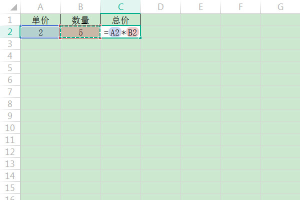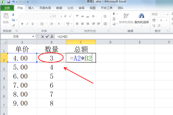 四、双击后,在单元格内输入公式“=A2*B2”,即等于单价乘以数量。