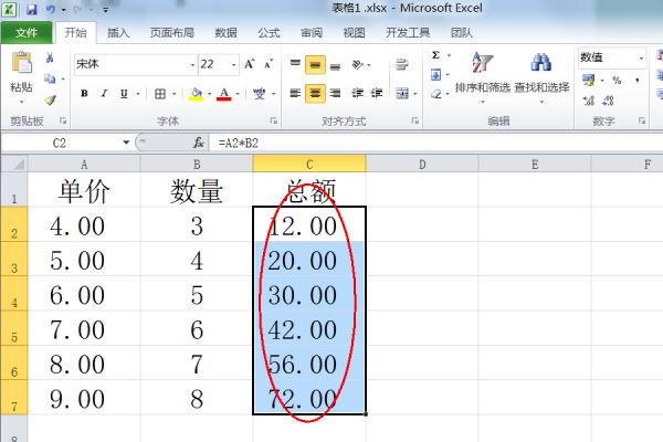3、选中下方单元格,通过Ctrl+D填充公式,返回EXCEL表格,发现在EXCEL中单价乘以数量操作完成。