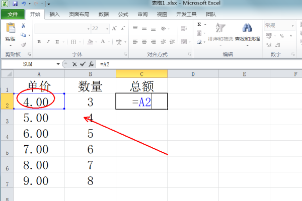 1、打开需要操作的EXCEL表格,在目标单元格输入=,然后点击选择单价所在单元格如A2。