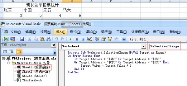 1. 打开VBA后,选择下图中左下方列表中你要实现此功能的表;在右边选择“SelectionChange”函数,此函数为相应表变化时(如点击不同的单元格),触发。