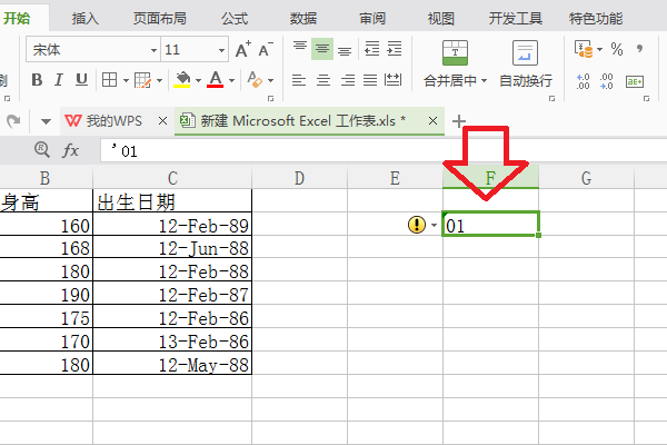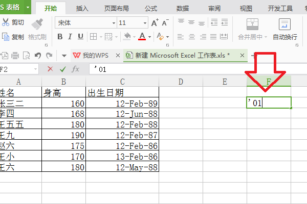 4、然后按回车键确认。这样即可把WPS表格里的数字1变成01。