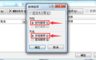5、默认的情况下,在你选择相应的数据之后,就会进行排序,在方向上是“按列排序”,在方法上是“字母排序”,再这样的规则之下,我们才能保证Excel中相同的信息会排列在一起。