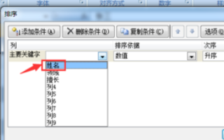 3、这时,会弹出“排序”窗口,在列的主要关键字中选择“姓名”,“排序依据”和“次序”执行默认选项即可。