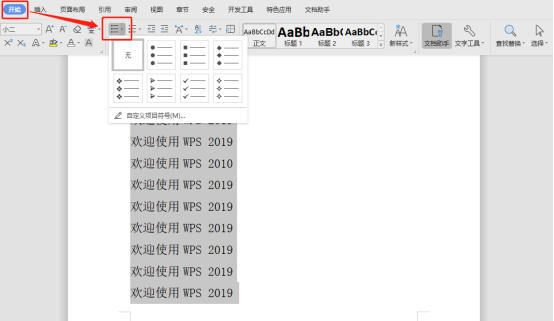 2.依次点击“开始”—“项目符号”图标,根据需要进行选择即可。