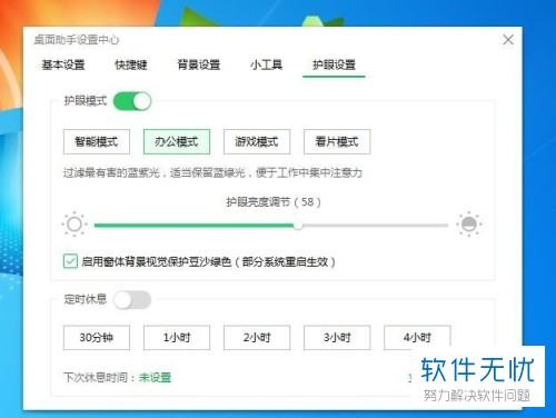 7.之后我们就可以打开桌面助手设置中心了。我们点击上方的护眼设置这一栏,然后将光到设置>50并<100。因为达到一百的的时候屏幕会太暗。