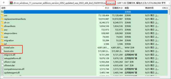 4.找到win11文件夹里sources文件夹下的install.wim和boot.wim两个文件(按文件大小排序,最大的两个),见图1;
