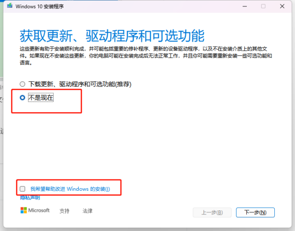 8.【非常重要】选择“不是现在”“勾掉我希望帮助改进windows的安装”,见图2;