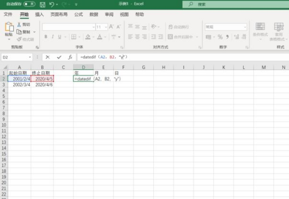 第三步、输出的单元格中输入公式=datedif(起始日期,终止日期,“y”),如下图所示: