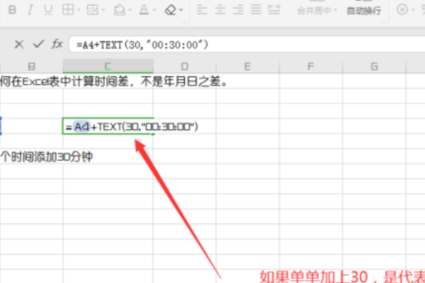 4、接下来在单元格中输入“=A4+TEXT(30,"00:30:00")”,这里就是把30换算成时间格式,那么相加就是分与分之间的运算了。