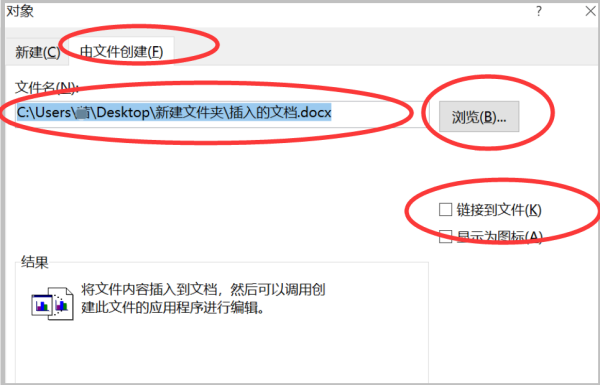 4、然后点击“由文件创建”并点击“浏览”选择文件,勾选“链接到文件”。