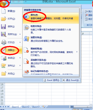 1丶首先点击左上角的office图标,在下拉菜单中选择准备,然后单击右侧的属性。