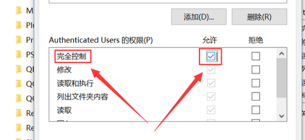 3、然后将新弹出界面中间的“Authenticated Users的权限”中的完全修改项调整为允许。