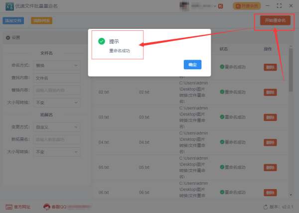 步骤3,然后点击【开始重命名】红色按钮,启动软件程序。稍等片刻当软件提示“重命名成功”,说明软件完成批量删除文件名中相同文字的操作。