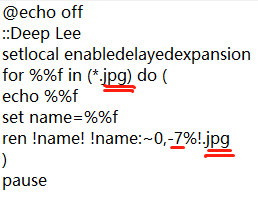 5、注意:此文件夹内的所有jpg文件都会删除后面3位!如果不是jpg格式换成其他,则需要多修改两处格式“.jpg”,“.mp3”,“.pptx”,“.docx”等等,注意总的位数也要变!此方法是按照删除同样位数的字符数实现的!