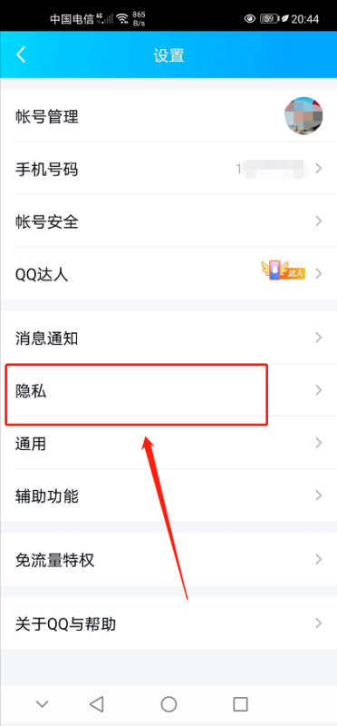 2、在QQ的设置界面中,点击进入到隐私设置。