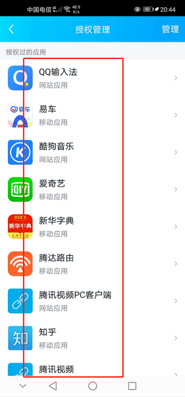 4、授权管理界面中的应用列表即表示QQ所登录过的游戏。