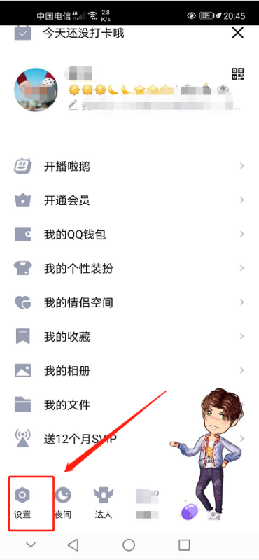 1、在手机QQ的主界面右划,点击左下角的设置图标。