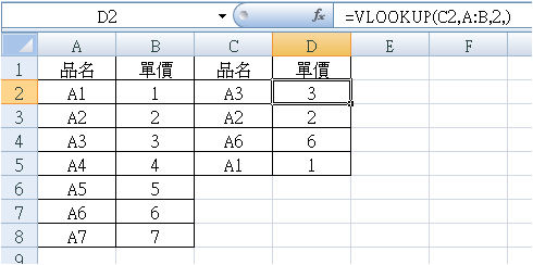 EXCEL2007 如果C列包含某些A列的字符则在D列显示与A列对应的B列的字符