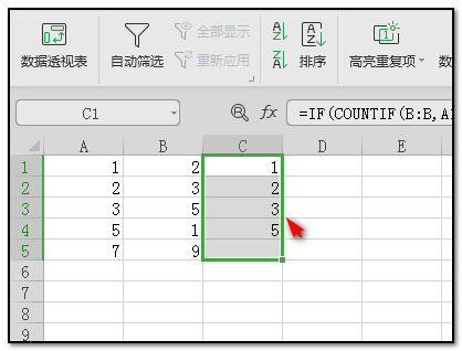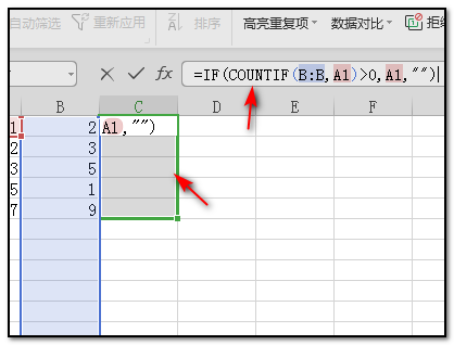 3.编辑数据后,选择C列中的单元格,并在编辑字段中输入:=IF(COUNTIF(B:B,A1)>,A1,"")。