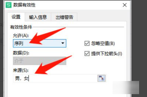 3、在弹出的数据有效性框中,有效性条件”允许“选择序列,来源输入下拉列表要有的内容,中间用逗号隔开。如下图所示”男,女“。