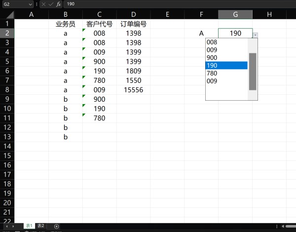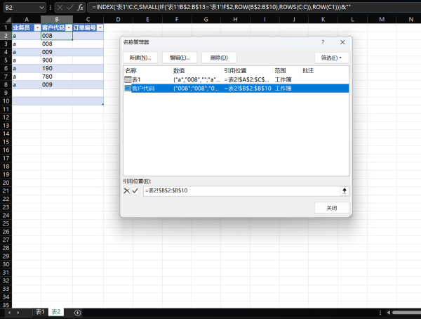 这样做的问题是每一个业务员需要创建一个表,表格的长度需要长一些才能保证数组公式运行,但是过长容易导致下拉菜单出现多余的空白值,所以就不推荐具体方法了,把公式贴出来,如果你能弄懂的话就可以试试这个方法,否则不建议