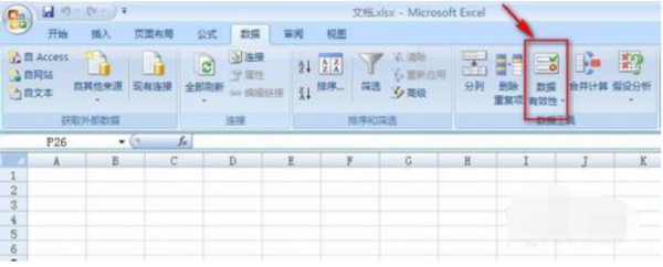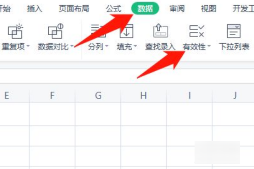 2、在表格顶端点击”数据“选项卡,找到“有效性”。