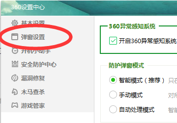 3、进入设置中心对话框后点击左侧菜单中的“弹窗设置”。