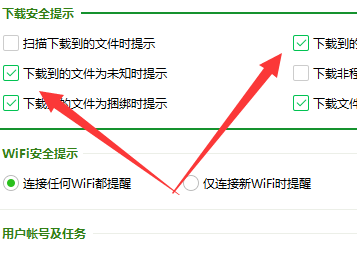 4、打开“弹窗设置”后选择需要关闭的安全通知项目,例如选择“下载安全提示”。