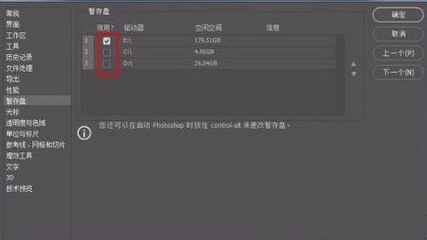 4、选择暂存盘,把盘全部勾选上