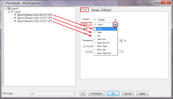 先在左侧的Layer1下点击一个图线代码,点击后它会变成灰色背景,代表被选中。然后在右侧的Style选项中选择一种线形:Solid代表实线,Dash代表虚线,Dot代表点线,DashDot代表点划线,DashDotDot代表双点划线,等等。依次点击左侧的图线代码,为它们分别选择右侧的线形。