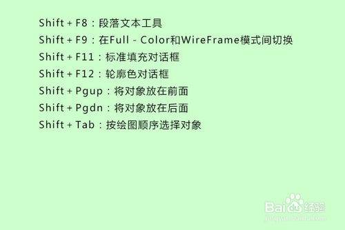 Shift+F8:段落文本工具 Shift+F9:在Full-Color和WireFrame模式间切换 Shift+F11:标准填充对话框 Shift+F12:轮廓色对话框 Shift+Pgup:将对象放在前面 Shift+Pgdn:将对象放在后面 Shift+Tab:按绘图顺序选择对象