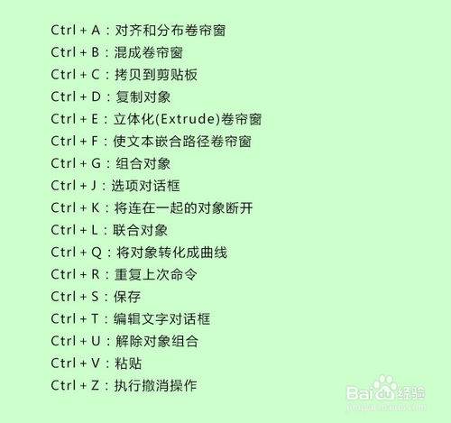 Ctrl+A:对齐和分布卷帘窗Ctrl+B:混成卷帘窗Ctrl+C:拷贝到剪贴板Ctrl+D:复制对象Ctrl+E:立体化(Extrude)卷帘窗Ctrl+F:使文本嵌合路径卷帘窗Ctrl+G:组合对象Ctrl+J:选项对话框 Ctrl+K:将连在一起的对象断开Ctrl+L:联合对象Ctrl+Q:将对象转化成曲线Ctrl+R:重复上次命令Ctrl+S:保存Ctrl+T:编辑文字对话框Ctrl+U:解除对象组合Ctrl+V:粘贴Ctrl+Z:执行撤消操作