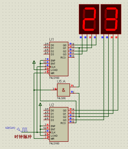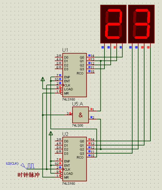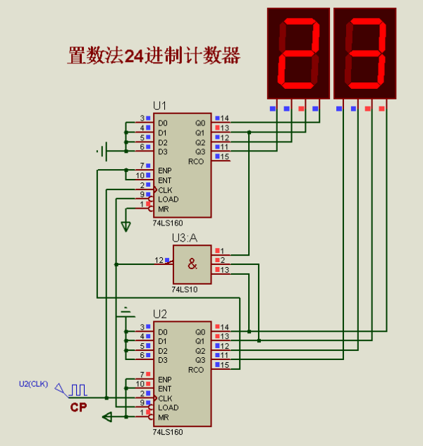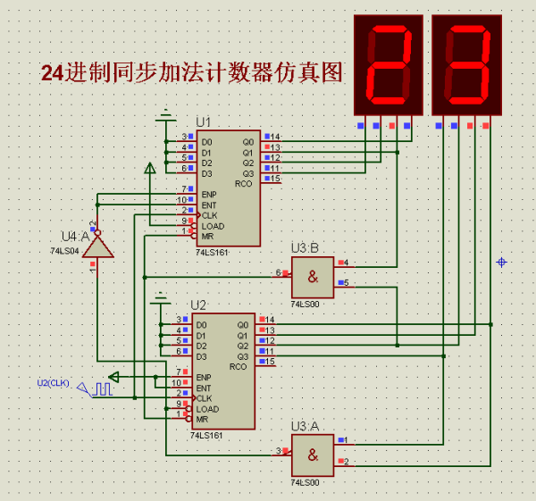 74160与74LS160的功能完全相同,都是十进制计数器。组成24进制计数器,利用反馈清0法,计数到24时,产生一个复位信号,使两个计数同时回0,实现改制,最大数是23。虽然利用24产生复位信号,但是并看不到24,具体设计如下: