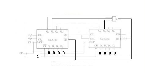 用74LS160设计一个24进制计数器,需要片74LS160,当计数到23时,十位为0010,个位为0011,取十位和个位中的3个为1状态的输出端,接到3输入与非门74LS10上,产生置数信号,加到两片74LS160的置数端LD上,两片的初值输入端全接地就可以了。