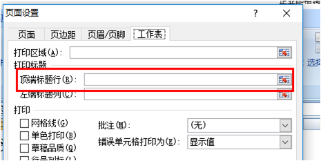 2)页面设置的工作表选项卡内,打印取悦设置“顶端标题行”,点红色框框内最右边位置