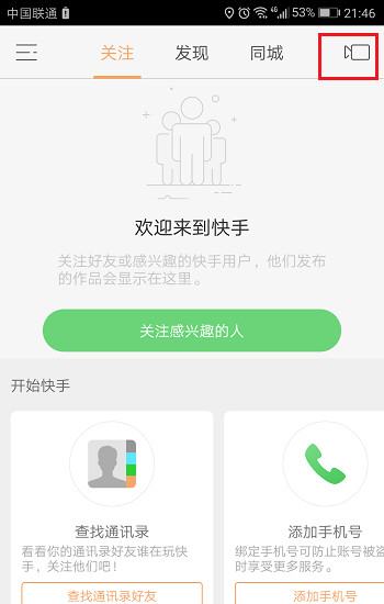 1、打开快手APP,点击进去之后,选择右上方的拍摄视频图表。