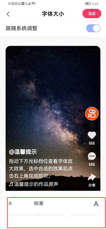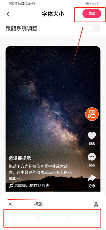 5、往左滑动字体会变小(如下图所示),往右滑动字体会变大,设置好后点击右上角的【完成】就可以了。
