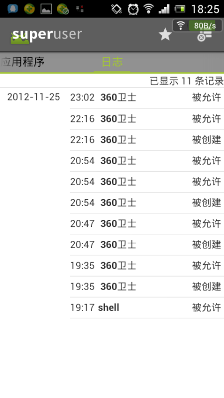 既然root好了就会自动出现superuser程序,如果你用的一键刷机那说明没有获得权限。如果你获得了权限,superuser打开后里面没有程序代表没有程序申请权限。你可以打开360手机卫士等等需要root的程序,会弹出小窗口请求授予最高权限,当然小窗口是来自superuser的弹窗,授权并记住后,superuser程序里面就会出现以下:
