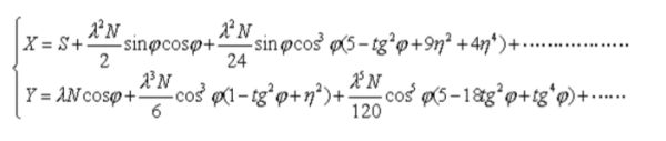 根据高斯投影的条件推导出的高斯—克吕格投影的计算公式为: