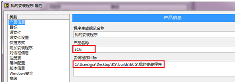 2.在“产品信息”中设置您的产品名称和安装程序生成目录,产品名称会影响安装程序所在的路径名,并且对应着在windows添加删除程序列表中应用程序的名字,如图