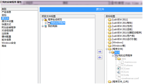4.选择“源文件”,在项目文件视图中单击选择之前创建的应用程序生成规范,然后单击添加箭头,将应用程序添加到目标文件夹中,右边目标视图可以看到添加结果,如图