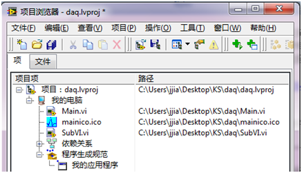 1.新建一个LabVIEW项目,或者打开一个已经建好的项目,项目中包含了您的vi,确保vi运行正常。一些通过文件路径来使用文件的代码在编译成exe之后可能会出现文件找不到的错误,对于此类错误,可以参考KB:5SD4CE7K,3HKEK93U,2T6GI6BH,18RDJ60O新建的项目如图: