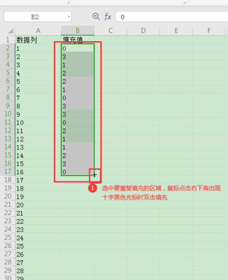 第二步:点击区域单元格右下角-当鼠标出现黑色十字光标时-双击填充
