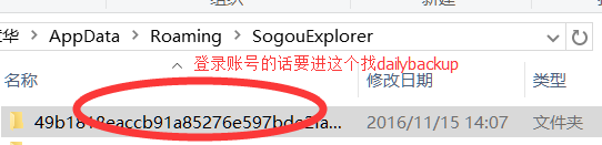 3.确定之后进sogouexplorer(如果登录账号使用的还要进一个长串数字字母文件夹的独立账号文件夹,每个账号有差异但是长短一样)。里面找DailyBackup文件夹。